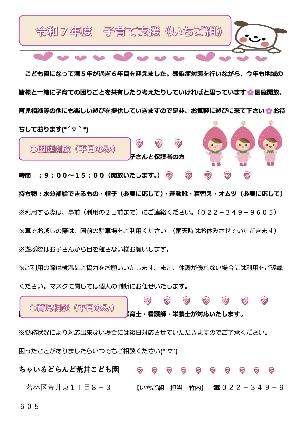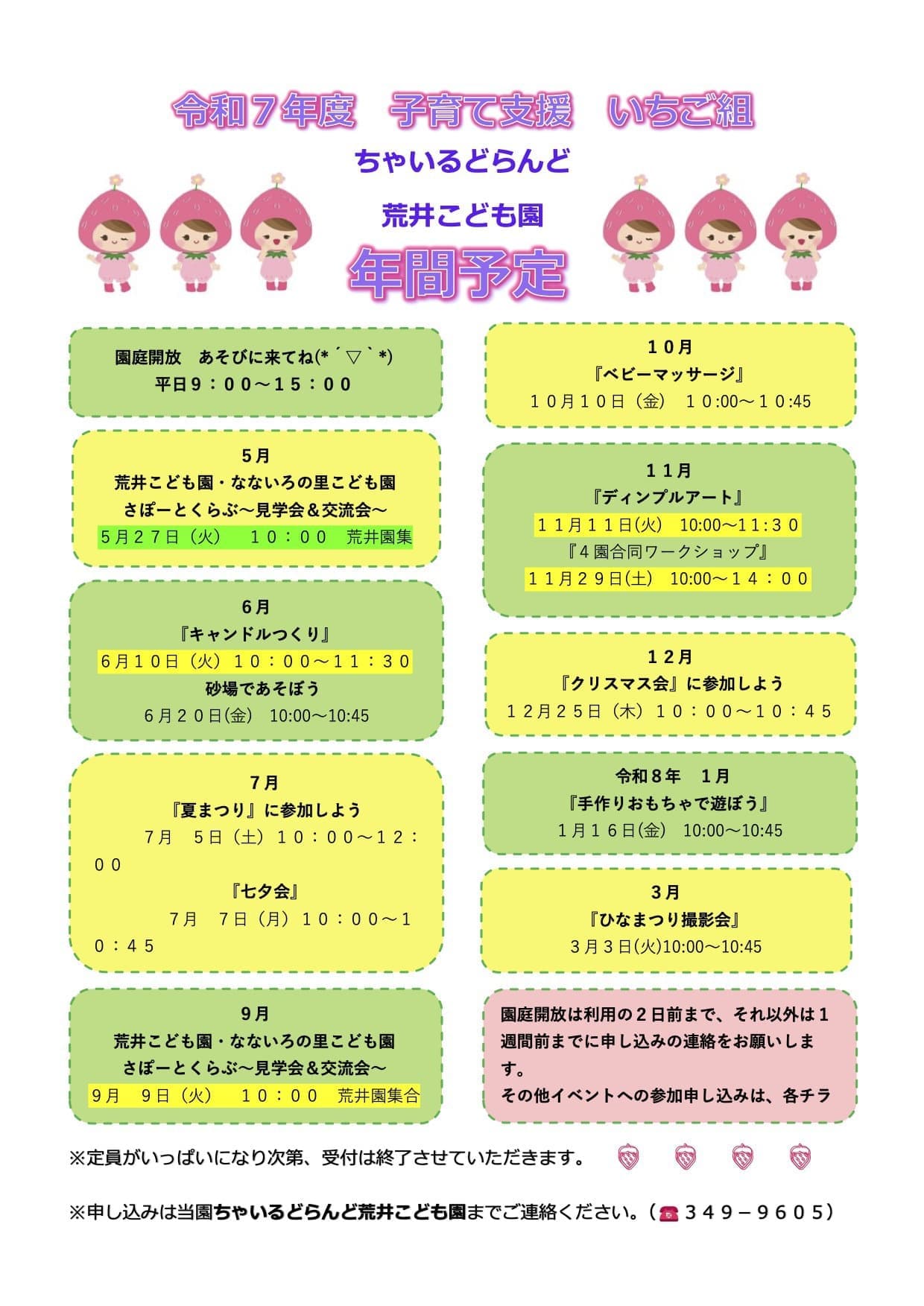 | 7月1日(火)~ | 平日 | 園庭開放 | 育児相談 | (保育士・看護師・栄養士) |