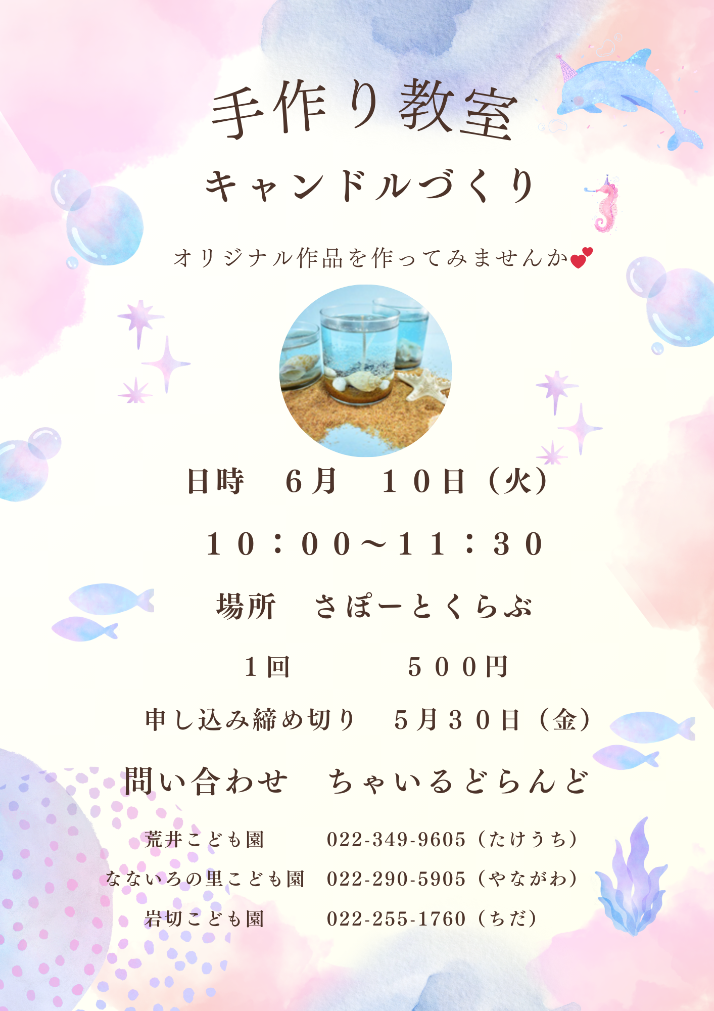| 6月10日(火) | 10:00~11:30 | 材料費 | ¥500 | 『キャンドル作り』 |
